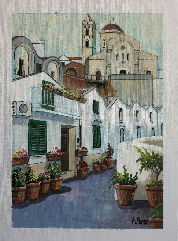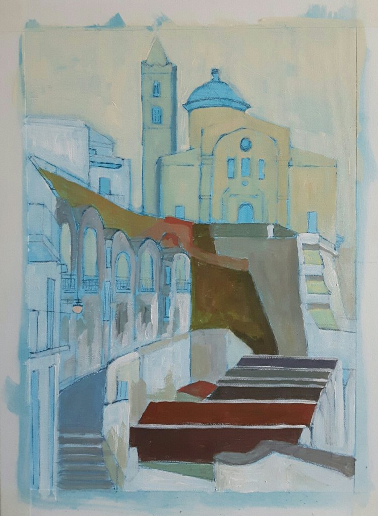 It has been a little strange having the door closed. I feel a bit cut off. However I worked on the first of the 3 paintings I had prepared and after starting at 8.30 I finished about 2pm.Ā I have painted in the shapes in the next one and am pleased to see that the composition looks good. They all have something I want to bring out and something that is a problem . Today I wanted to make the house with the flowers stand out , but wasn’tĀ sure if the church which I had moved would look ok. I think it does. Then the next one is I think like a lovely pattern of coloured shapes but no flowers or bright colours which often makes something commercialĀ . I like it already butĀ ……..