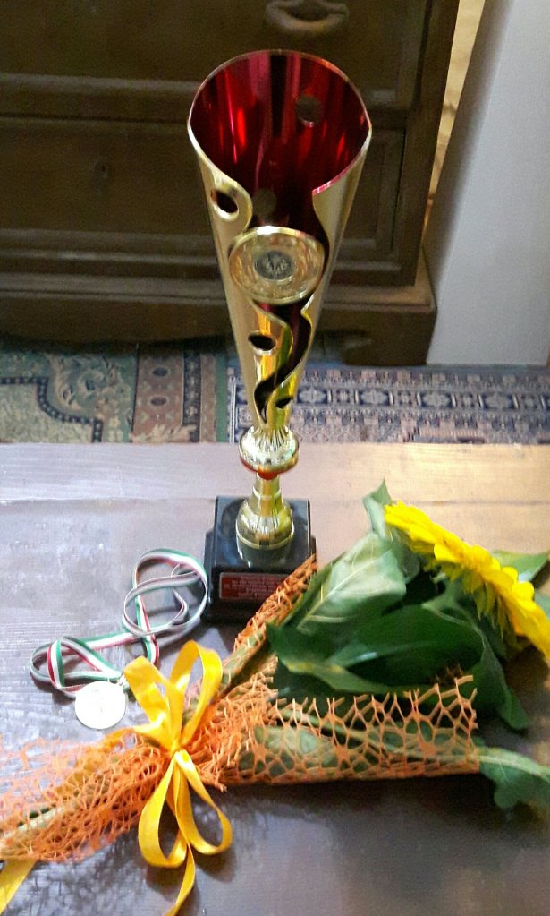 Luckily It stopped again after about 20 minutes and I set off to the piazza. It was fun. The usual person won , there was lots of speaking and clapping and everyone got something to take away.  I got a trophy, 2 certificates, a medal and a sunflower. And a lot of really good advice from another  artist. I am definitely going to buy some other colours.