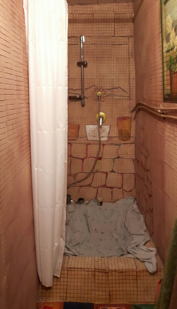 Without thinking too much about it I got out the old duvet cover I use as a dust cover and covered up the base of the shower. 20 minutes later I had drawn in a rough sketch on the tiles. So now I know what I will most likely be doing over the weekend. I had some spare paint ….it would have been a shame to throw it out.