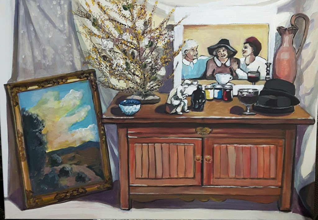 I am not completely happy with the result so am going to change the portrait at the back for a daylight landscape of the same view as is in the gold frame. I like the “things” to be related and the evening scene and the triple portraits were both in competitions. Still morning and evening of the same view will do. There may be some artistic word for what is wrong with the arrangement as it is , but I don’t know what it would be. Which is why I think teaching art is a skill I don’t have. Mostly I just “go for it”. And keep on until it feels “right. “