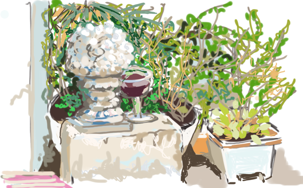 I found some more David Hockney short films and in one he was looking at cigarette butts on the floor and saying even they were beautiful. So I was inspired to get out my Kindle and draw my view from my doorstep. I started it 4 times as I wasn’t sure which angle to work from. I am pleased with the result.