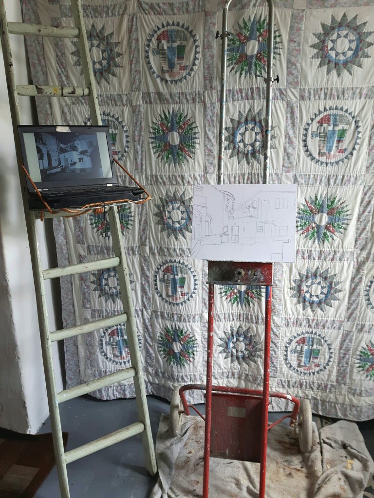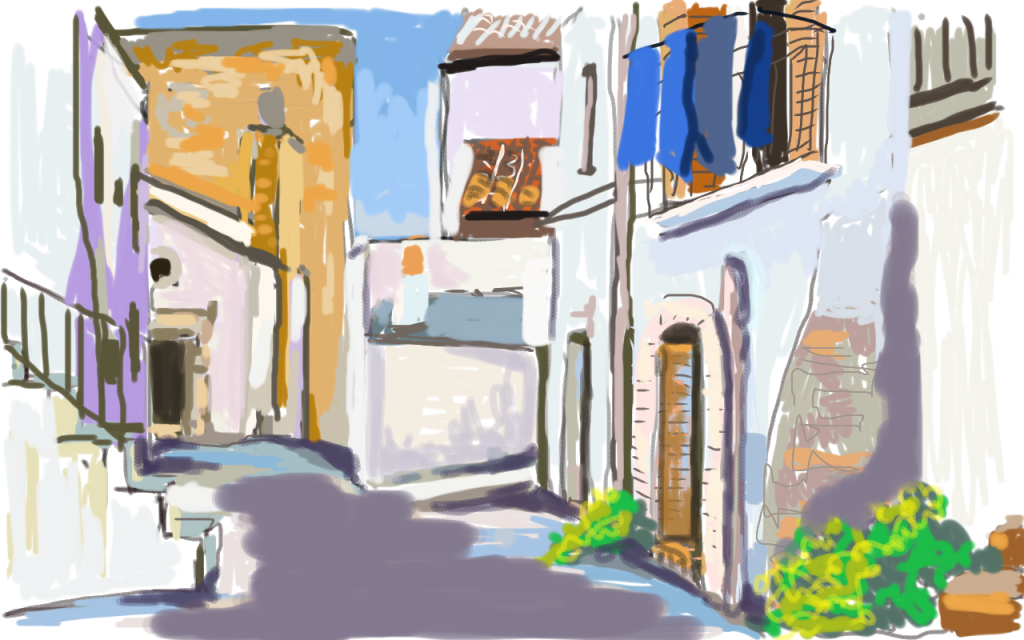 It started with me walking up the red brick road and then sitting on the steps of the water tower while I drew another Pisticci scene. It worked very well .I was relatively comfortable and no one parked right in front of me. ( one time I was painting a scene from life in another town and a truck pulled up in front of me and started to take all the furniture out of the house I had been painting. ) But today , apart from some guys who seemed to be inspecting the water tower it all went fine.