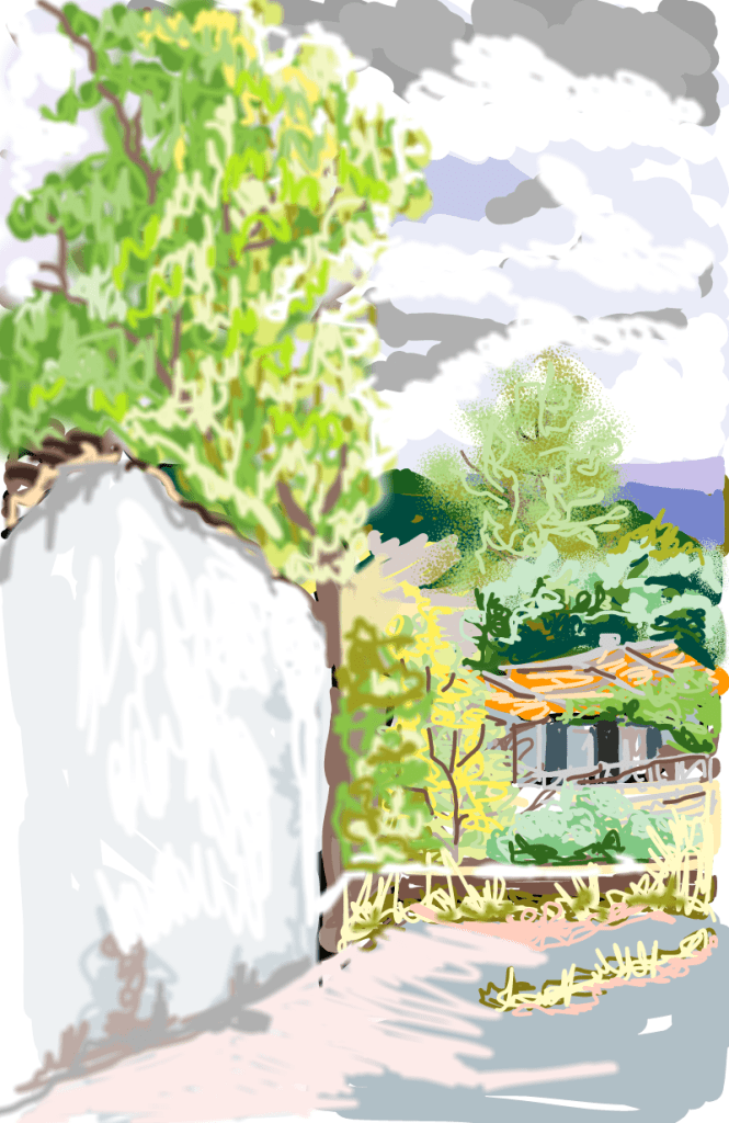 I drew the scene at the end of my road on my new tablet and I could see the screen well enough. Good- I didn’t give up and it would have been better if I had not been so tired. Bad- I was supposed to paint a plate of fruit on a canvas today so I was just wasting time.
