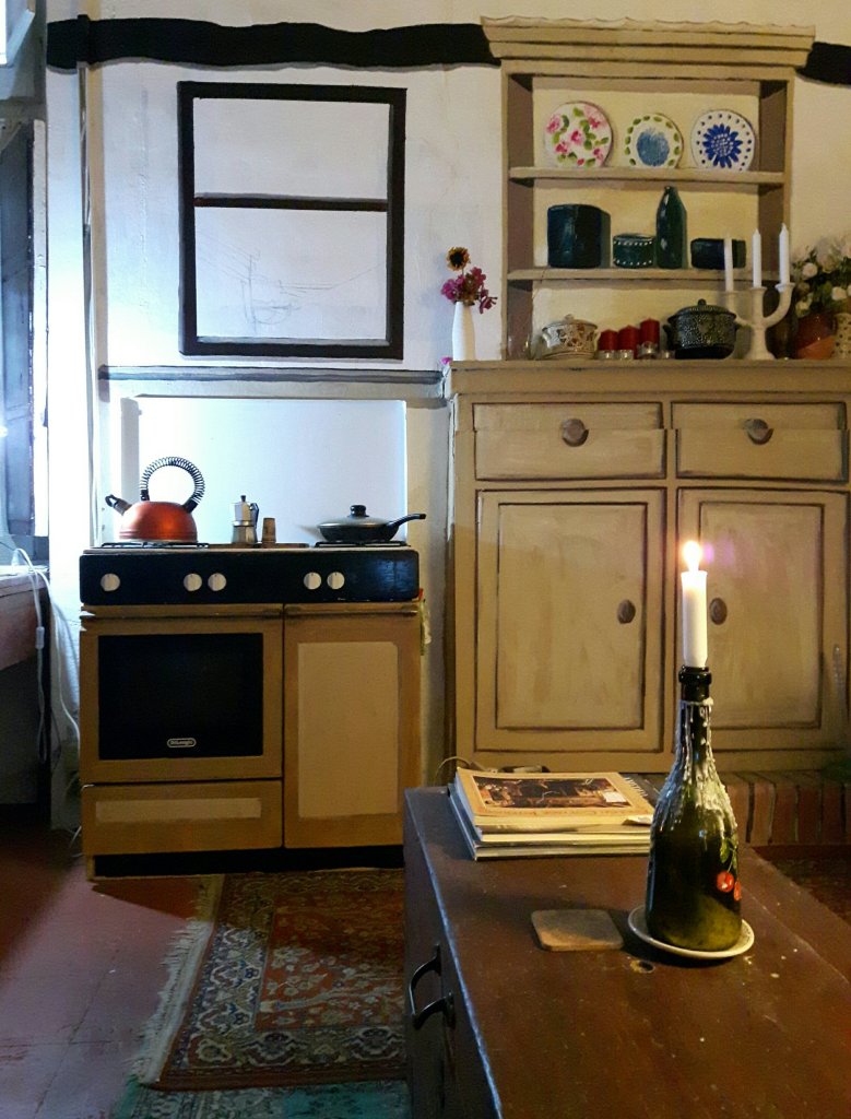Thereafter I went for it. I mixed all my own colours. Painted one wall green and the woodwork dark brown. I started to paint the floor with an undercoat, but it was so damp it wouldn’t dry. So I covered half of it with thin washable rugs like a patchwork and painted the dry part. I painted a big window on a bedsheet and hung it from a wooden spar to hide the worst damp wall. .Then I painted myself a welsh dresser , a tiled table and a vintage cooker. ( I painted the actual.cooker ) I made a painting of a window upstairs and painted the floor white . And on and on……..