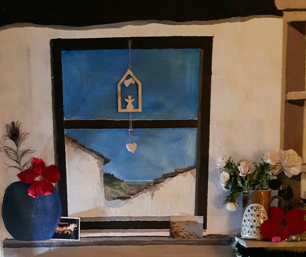 I worked on my new window most of today. It wasn’t that there was a lot of work , just that I didn’t think it looked right so I kept changing it. I am reasonably happy with it now. It’s a mixture of paint and objects. I like that it’s a sort of joke. I also like that I can see the sea.