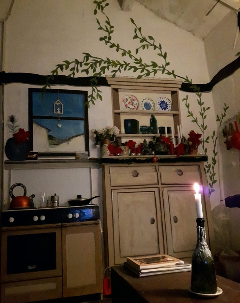 Sitting here looking across at the wall it reminds me of an illustration in a children’s book of the type that was popular when I was small. Especially now with all the red flowers on the mantelpiece.