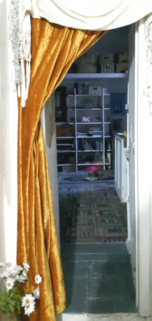 In the afternoon I thought I would carry on tidying my work room , so I emptied three shelves in an alcove which had been hidden by a curtain, making it possible for me to have thrown things in any old way for the last year or so.