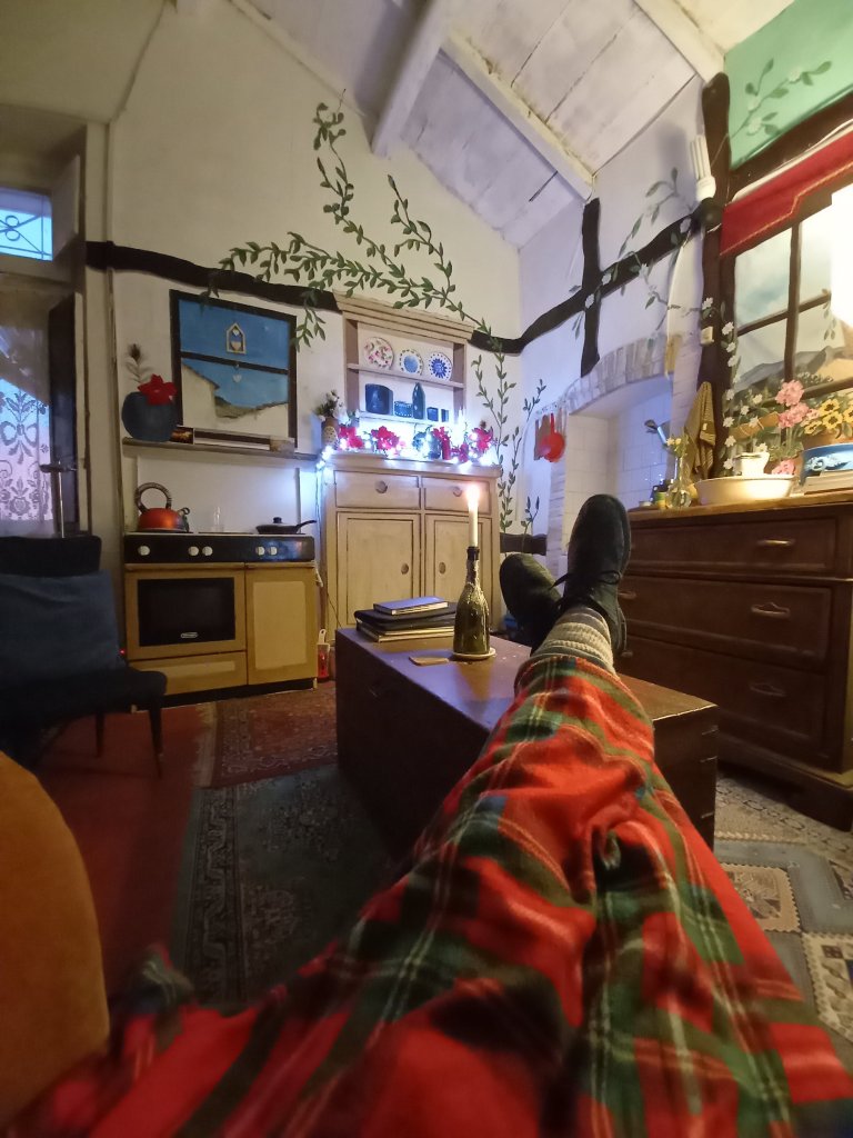 I remember one night when I was in bed and I was congratulating myself on being so cosy. Then I looked at myself and laughed. I was in the little room at the back with the stairs in it. It was the smallest place to heat and leak proof. I was wearing all my clothes in bed ( obviously not my shoes), I had a double duvet folded in half and a fur rug over the top of me and 2 hot water bottles. Oh …and I was wearing a hat. I was watching an episode of Desperate Housewives which was on a Dvd in my laptop next to the gas heater which was on at low in the doorway. Bliss !!!