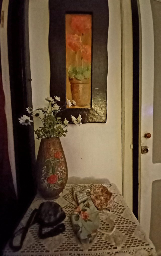 And finally as I was a little bored, though warm, and had already cleaned all my equipment for possible mural painting again tomorrow, I decided to turn my table around. That in effect blocks the door and makes it a window. I think it looks nice and makes the room look bigger. In the spring I can turn it round again so that I can use the door.