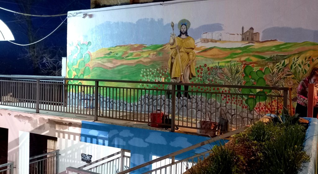 It wasn’t raining so painting went well and by lunch time I had finished San Rocco and varnished him. In the meantime the rest of the painters have been working on countryside and local plants. The whole wall is now really coming together.