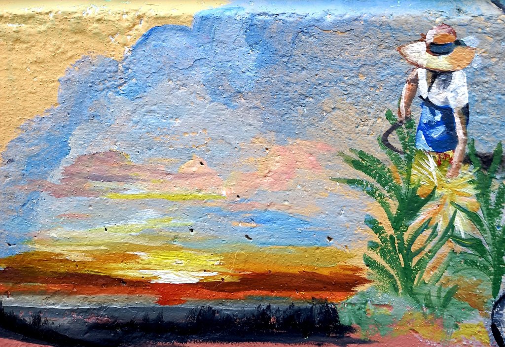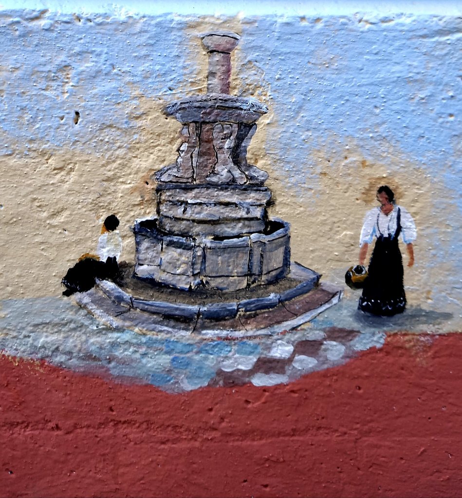 The mural, that is. But it’s close. I have never painted so fast in my life. Never have I said. “Okay. I can do that.” to so many things I have never painted before. And in full view of people watching. No practice, no hesitation. 20 mins to draw and paint a complicated fountain and then what about a couple of figures… standing like this , however wearing different clothes.