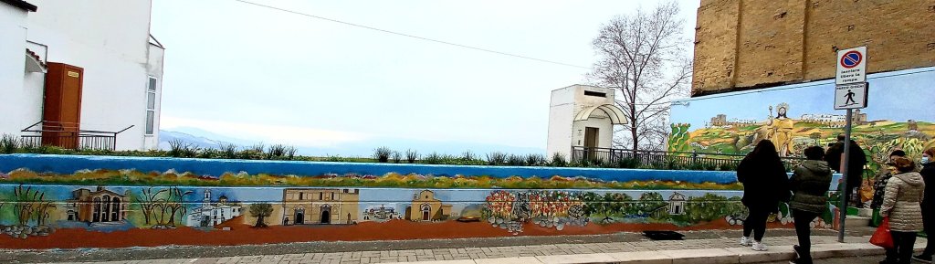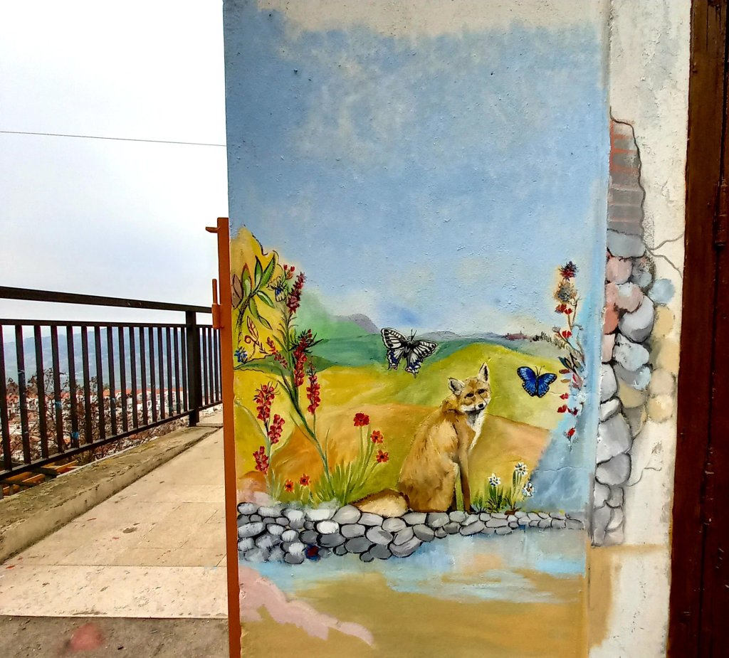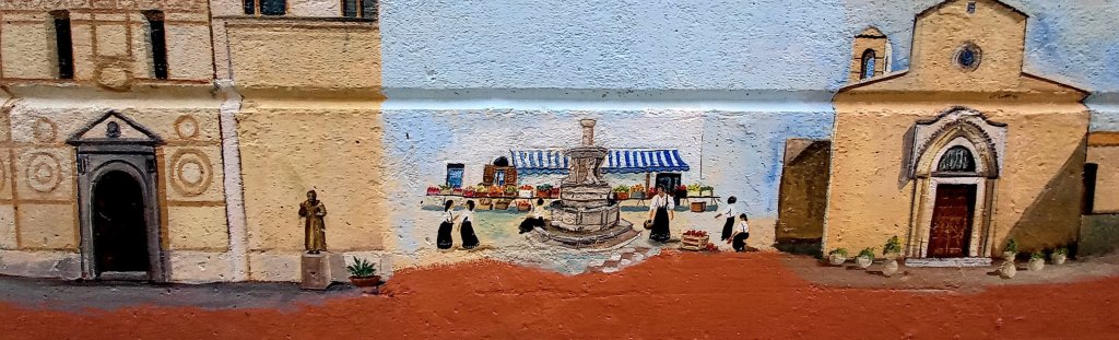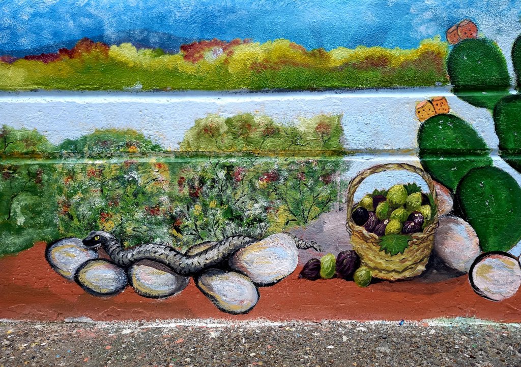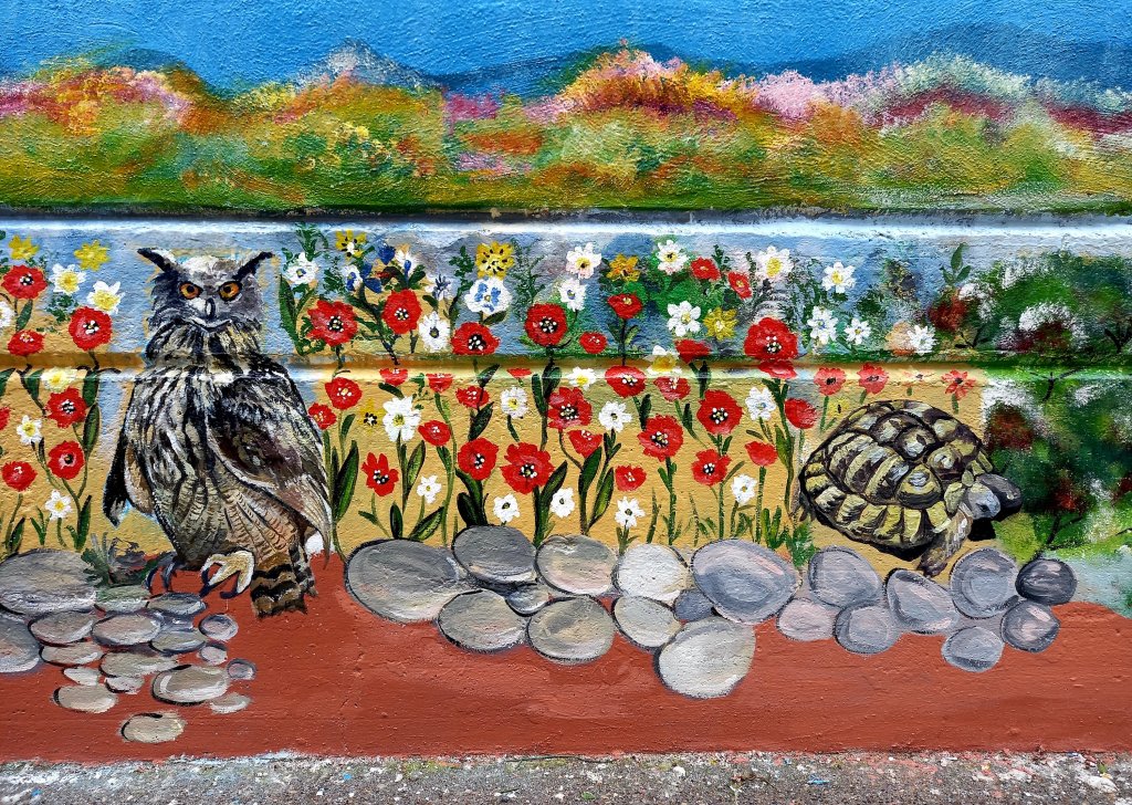Today I painted a basket full of figs, a tortoise, a viper and a little market scene. The whole mural is now varnished. There are new plants decorating the top of the wall and the whole thing looks really impressive.
