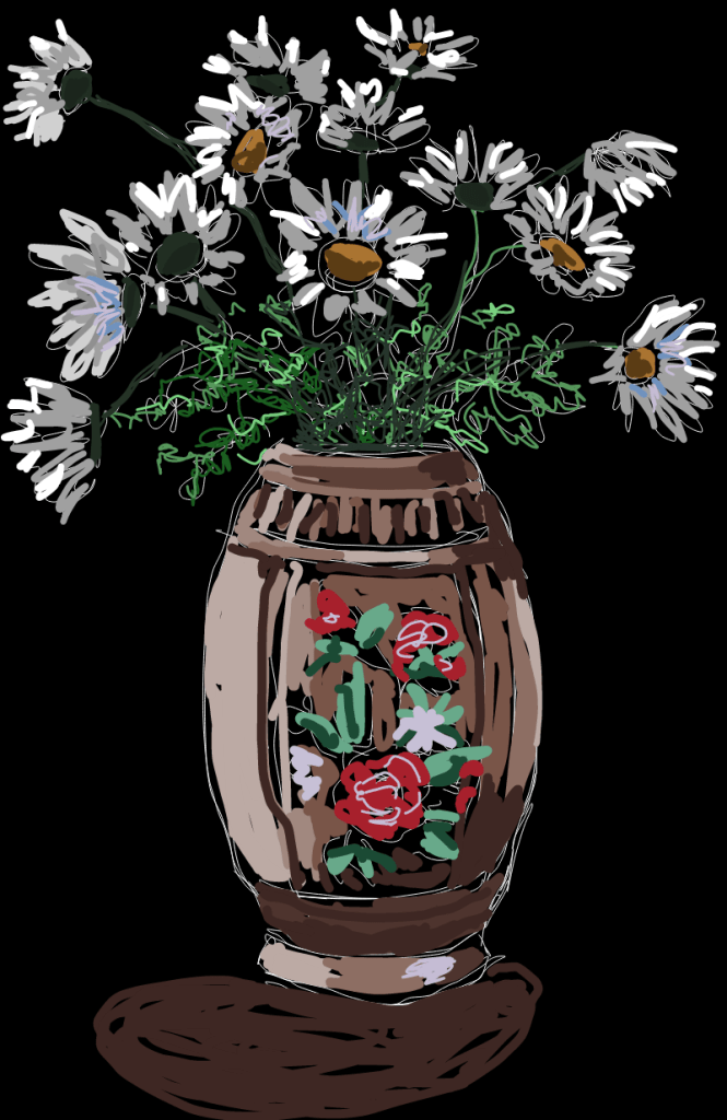 After lunch having tried several distractions I thought I might do a digital painting . Haven’t done any for ages. I put a vase of daisies on the wooden chest and remembered how much I enjoyed drawing on the tablet. It turned out well and I sent some friends a copy.