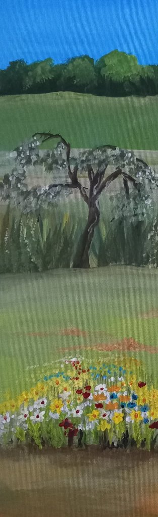 I found a painting by Klimt of flowers and liked it so much that I used it as reference for the wildflowers in the background. Tomorrow I need to finish all the details in the windows and the roof.