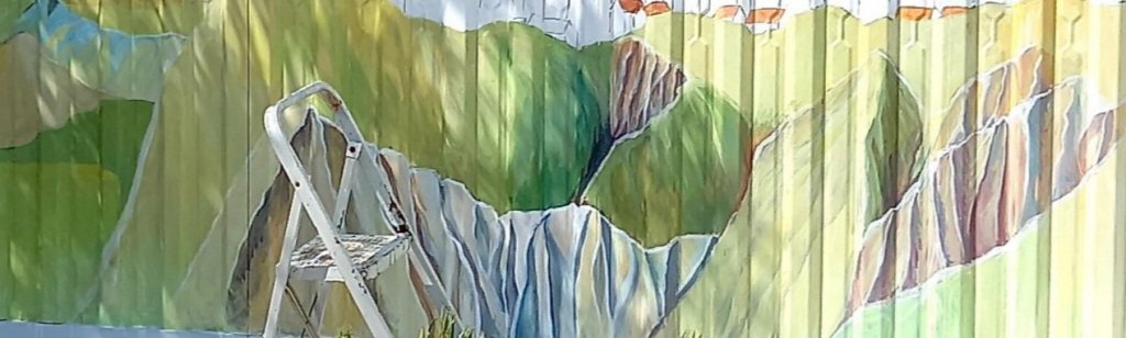 It was a bit stressful to begin with as usual , but since then mural painting in the country has become mostly a pleasure. It has been , and is, challenging, as although I have painted all the subjects in it before I am having to invent how to put them together, change colours and work on an uneven surface while the sun dries the paint sometimes before I can blend it and the paint in my plastic carrot container palettes dries out in an hour if I don’t cover it.