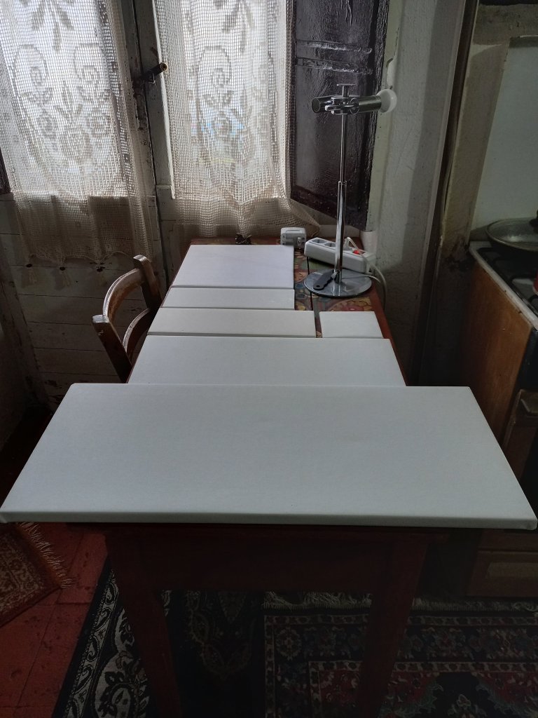 I brought them through into my living room. I thought maybe laying them all out on the table would inspire me. They are supposed to be my Easter project. All made from offcuts of wood and canvas. None of them are regular sizes. If I want to make them more commercial I need to paint the sides as well.