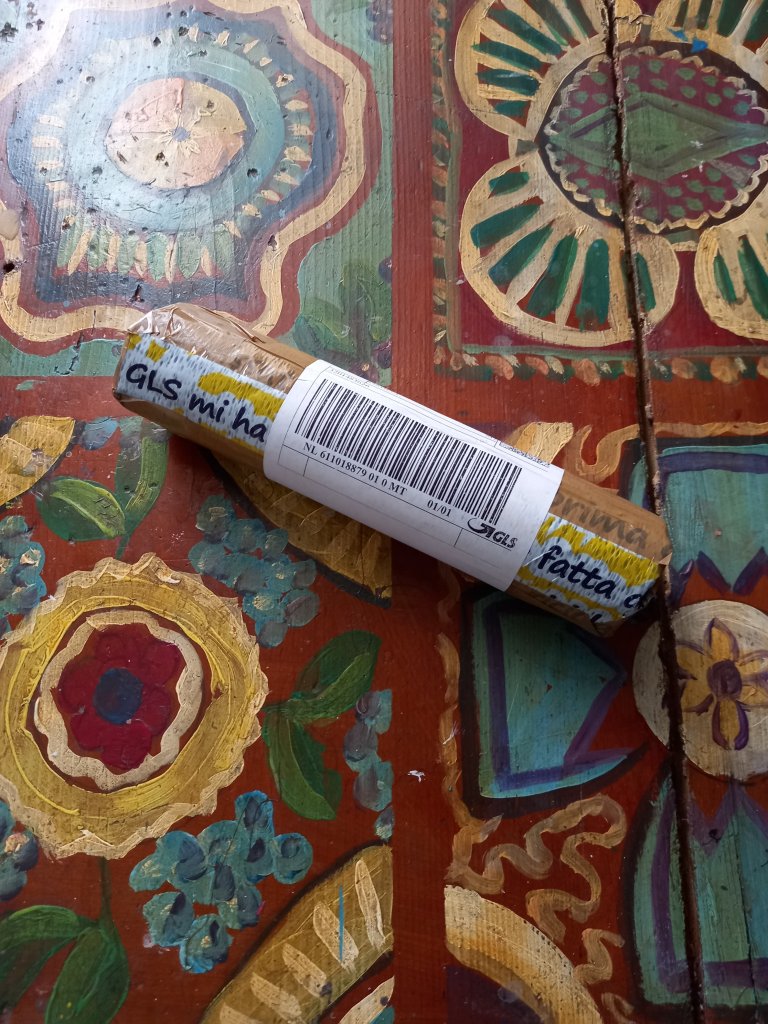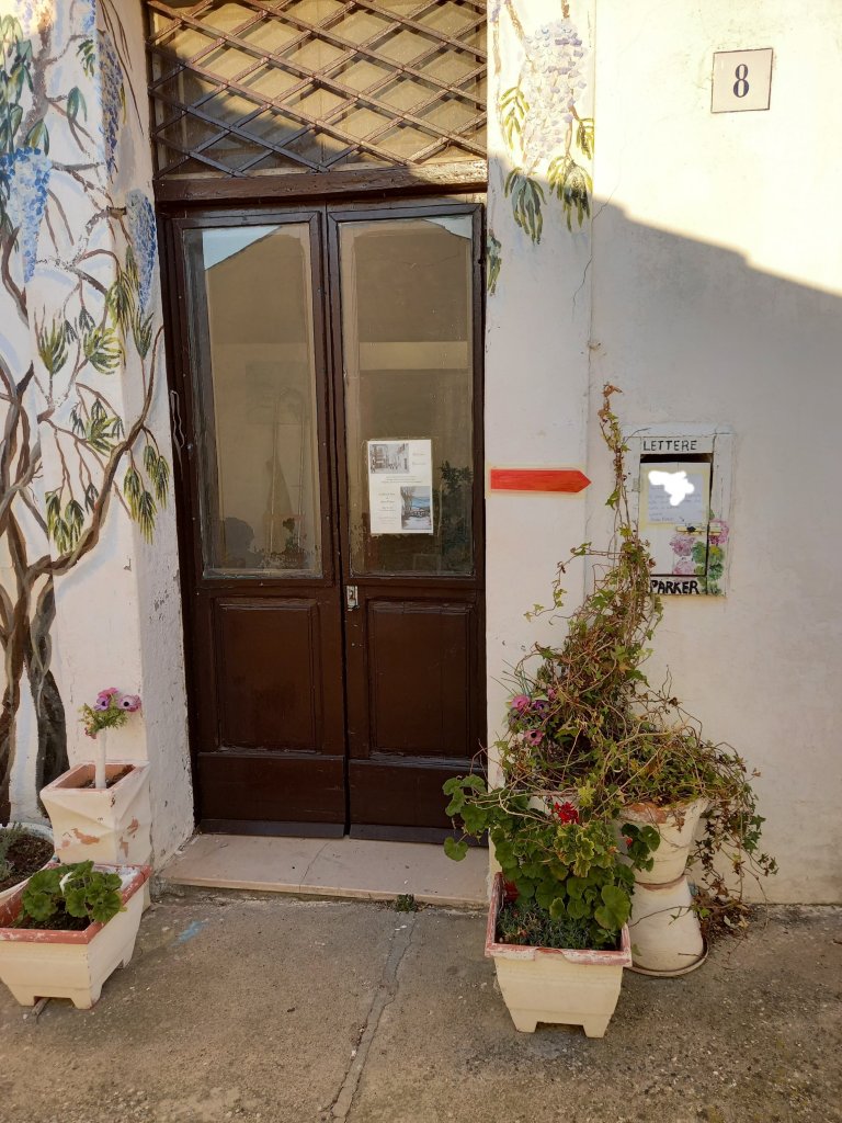 Was happily muralling along…..painting cactus leaves like a machine…..when my phone rang and it was the delivery man asking where I was. I tried explaining about my ” cassetta delle lettere” and the ” picola porta” ( I do try my best.) However he suggested that it would be much simpler just to leave the parcel in in the fruit and veg shop. As I would be getting dropped off there after finishing painting that suited us both. ( plan C. )