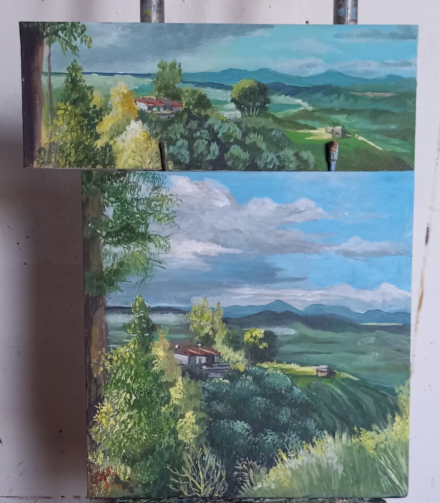 After having 23 different reference photos to chose from to paint I decided to paint from the photo I took this morning of the view from the end of my street. Not only that, but I thought I would do a square version and a long narrow version.