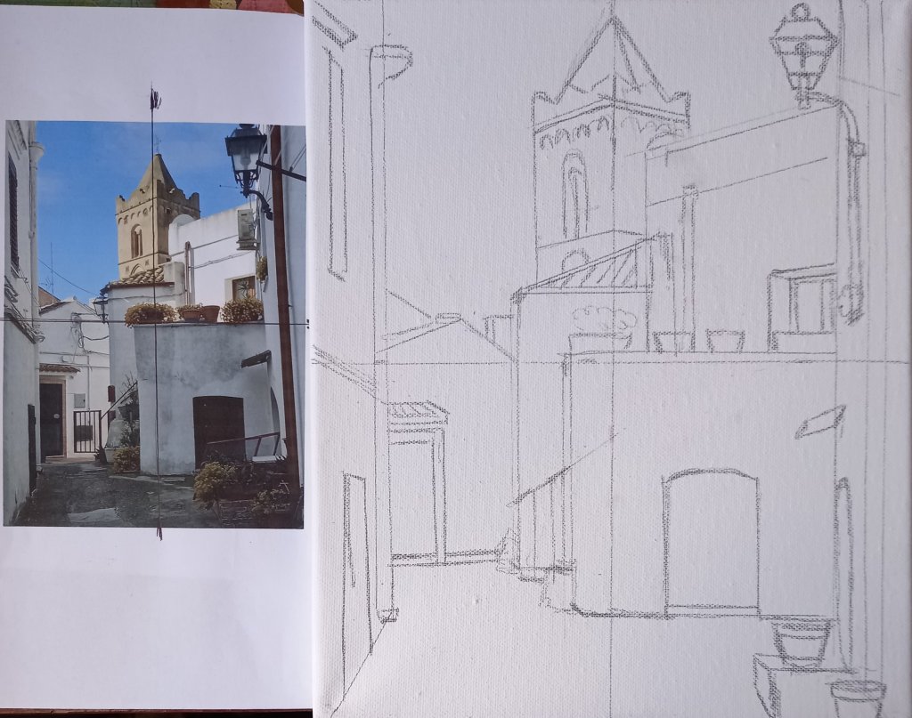 Now I’ve drawn my next sunny scene to paint. There are 3 small 30x24cm canvases and I have 3 more scenes.