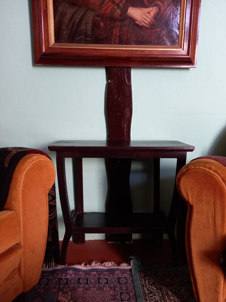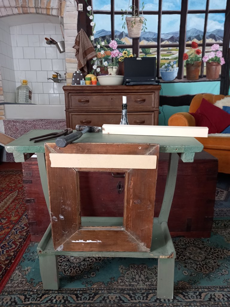 I should mention that it is a little table which James cut in half and put legs at the back at the bottom but nothing to support the top and gradually the top started to droop at the back….which was when I had the idea to jam in the frame. It worked , but looked a little odd.