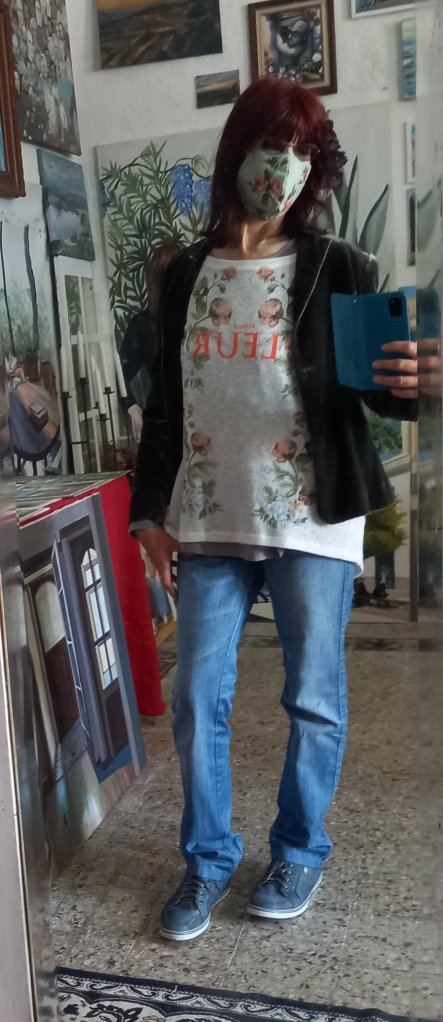 Today I wore a velvet jacket and ” designer ” jeans ( the man with the suitcase said they were, when I bought them 10 years ago in Taranto🤔.) And I wore one of my new €2 tops.