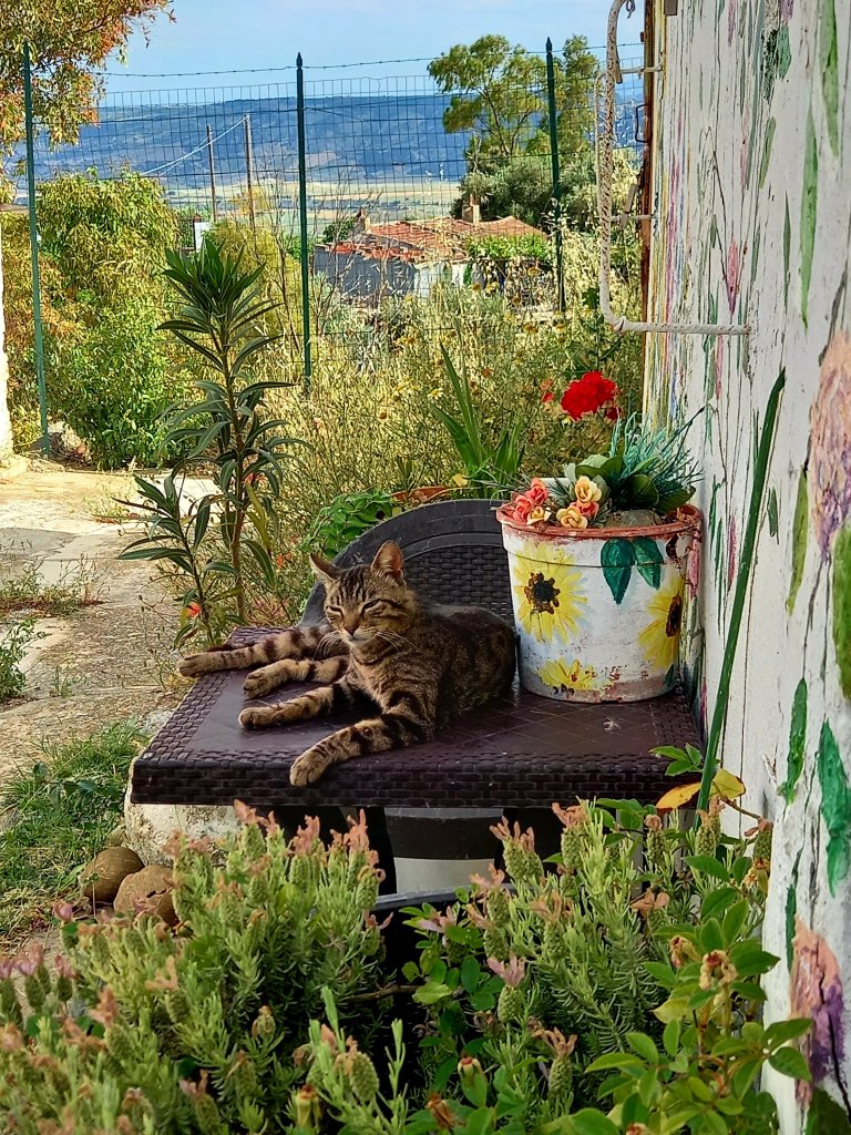 Finally my doorstep is just about perfect. I can see out over the hills in one direction and through the oleander up to the castle in the other. But no one can see me unless they are very close.