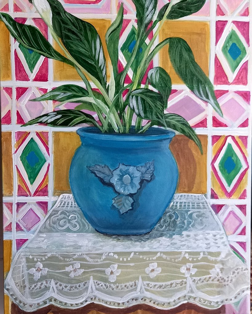 I started with a rough sketch using a pastel pencil. ( Which then made everything a bit blue. Not doing that again.) After that I painted the tiles, the vase and the lace before finally painting the plant. I think it’s very successful.