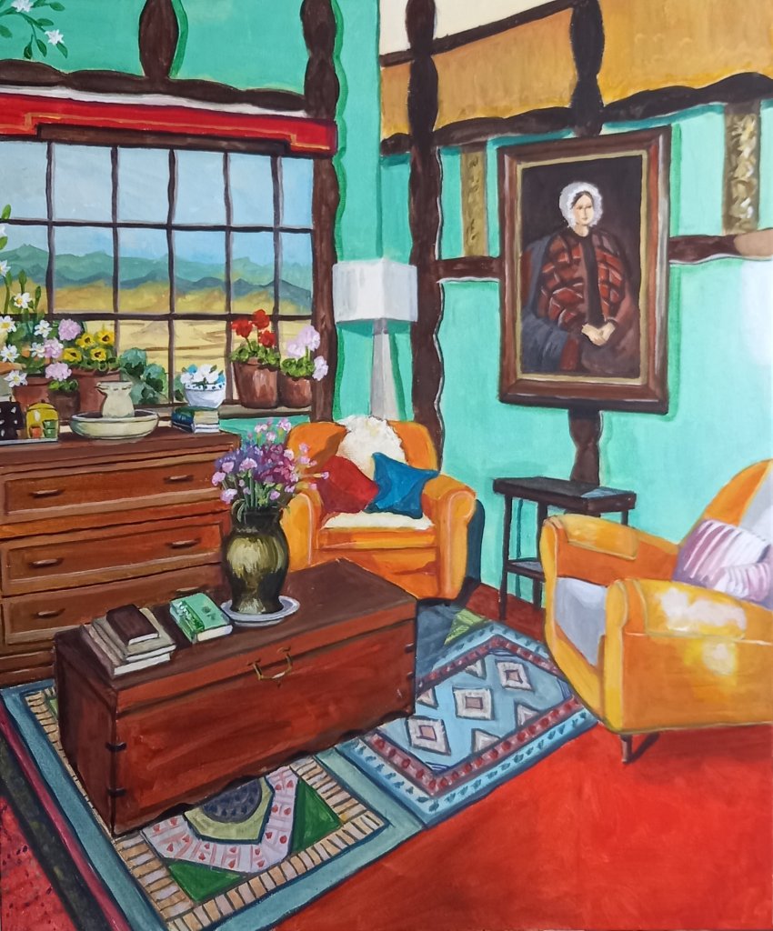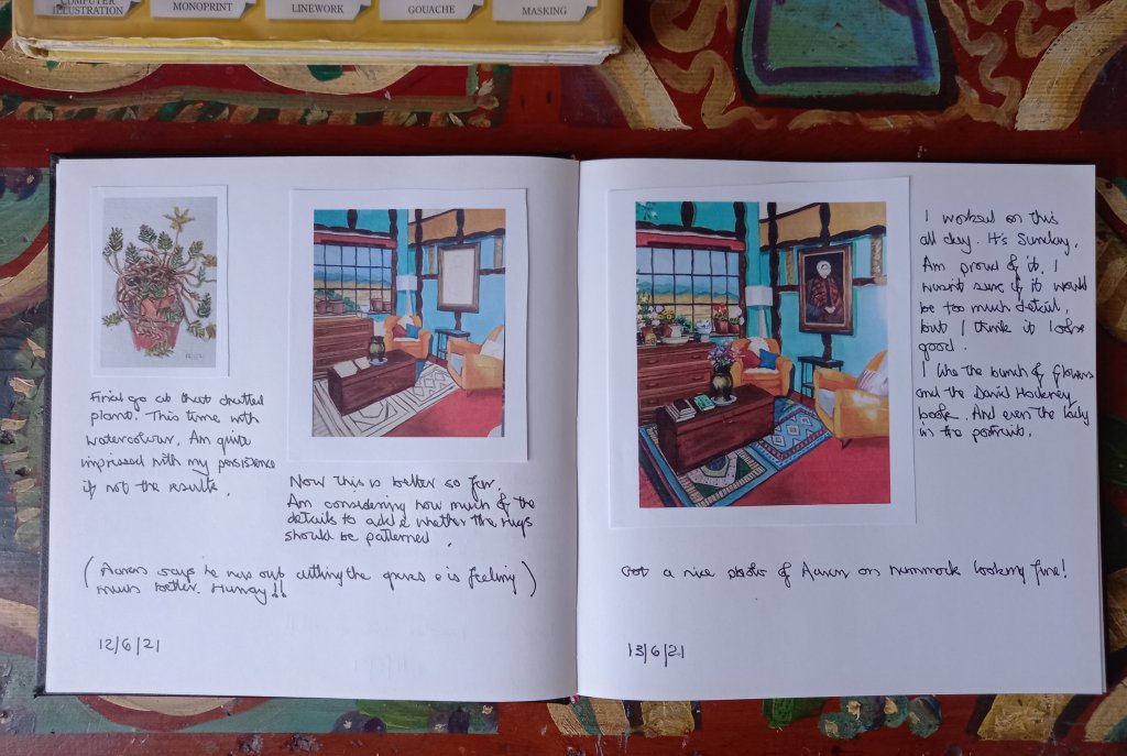 It was my second day on the colourful painting of my room . It went well and I am pleased with it. I am impressed with myself for having the confidence to give it a go in the first place. It was pretty complicated, but it has turned out close to how I imagined it. That doesn’t often happen. It is a treat to paint something just for myself.