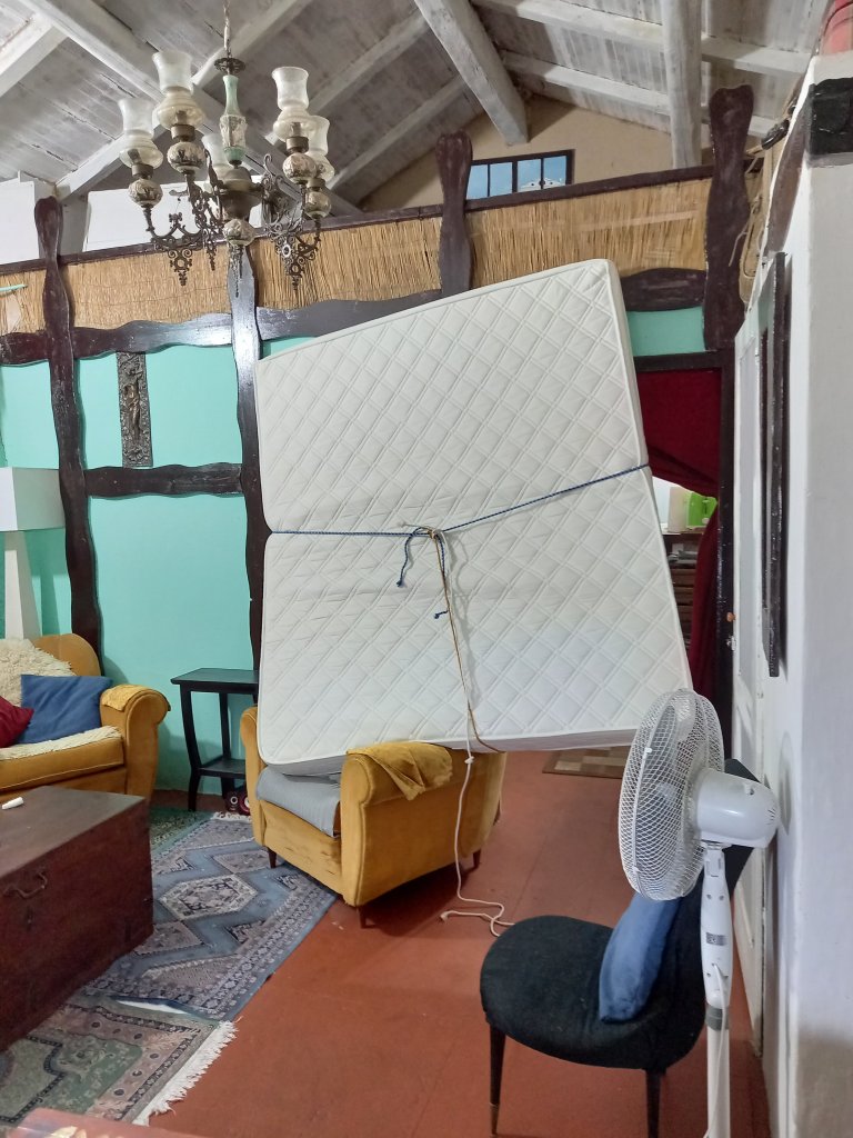 So without further ado I jumped up and stripped the bed. The mattress was on top of a bed sofa and it had always been my plan to get it into the attic for the winter. My tiny single bed up there was okay , but a big new mattress would be a treat.