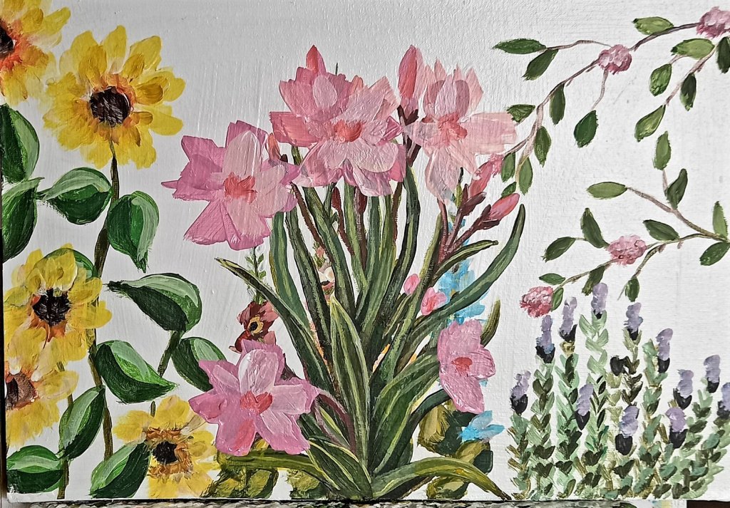 “Loosely” was mostly ignored as I pretty much just did what I always do. Except that I chose to paint my small oleander in front of my painted wall just for fun.