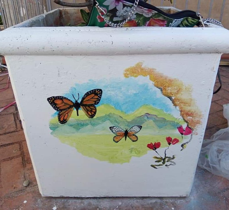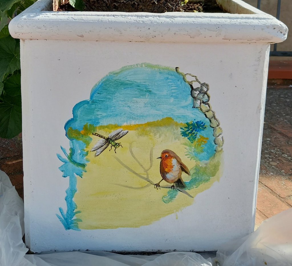 Apart from that, today started at 7am at the bench painting piazzetta.It is not only benches which are being decorated but also flower containers and even the fountain. My contribution was 5 butterflies , a Robin and a little insect called a libellule. What a wonderful name . It is pronounced ” leebelloolly” . Cute!
