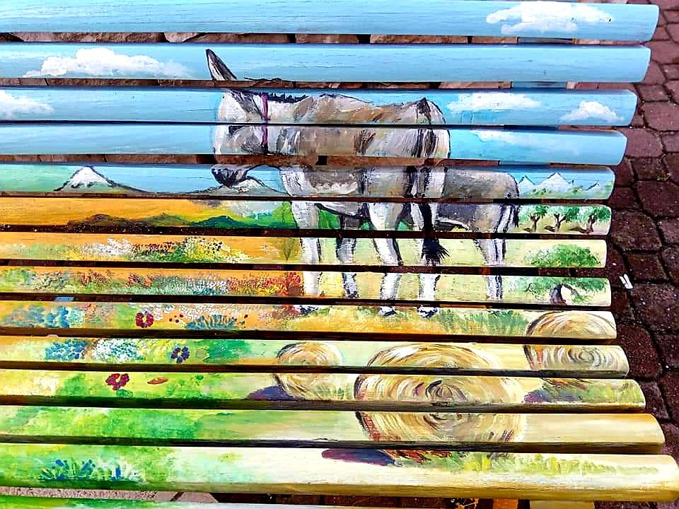 Wasn’t so inspiring today. I learned that animals are much easier to paint on benches than round straw bales. Did my best , but was not impressed. I did fix the donkey’s tail though and paint the background lighter so its legs looked better. I also painted a few olive trees and some clouds.