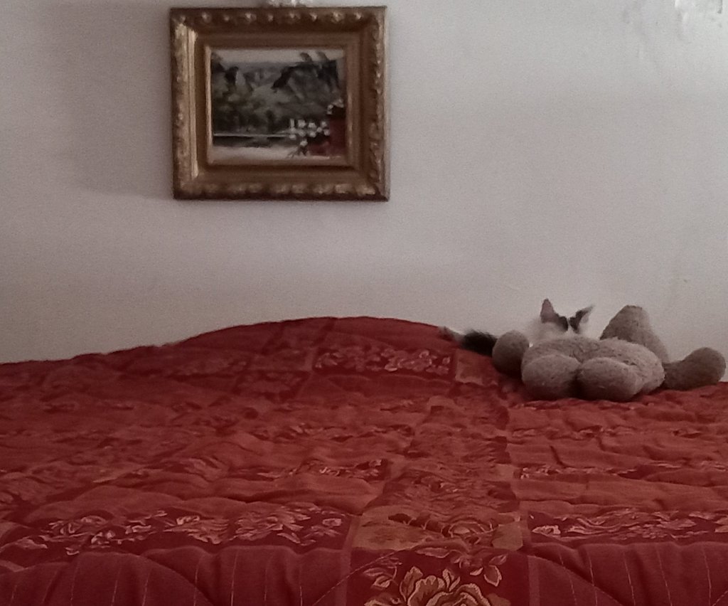 That is the second time I have found it strolling about or lying on my bed when I had no idea it was inside. Right now it’s upstairs asleep cuddled up to Ted on my mattress in the attic. It may have been there all day as I don’t go upstairs very often.