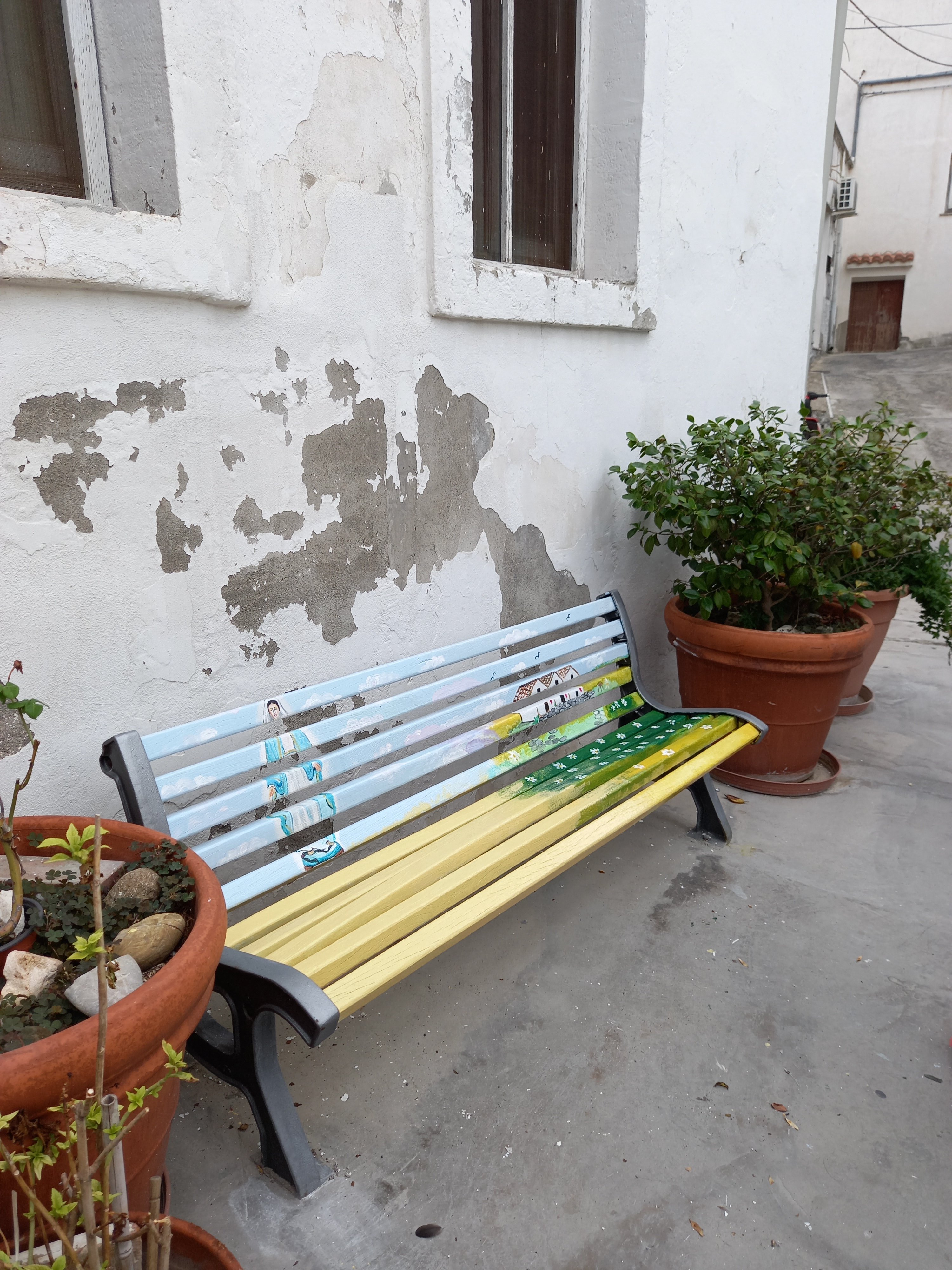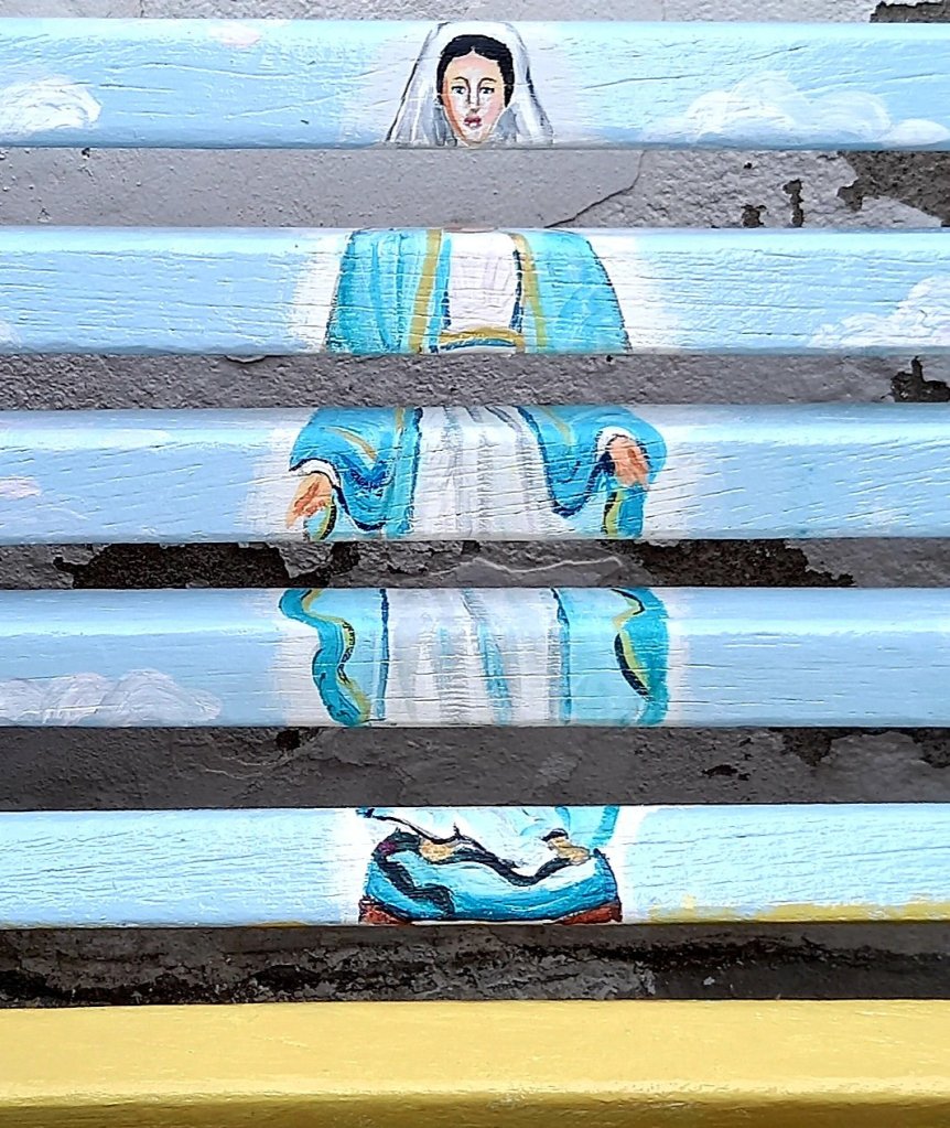 It has been a lovely , if rather uncomfortable experience, painting benches. I have enjoyed painting lots of things I’ve never painted before and I have loved being part of a team. Hopefully we will find another project to work on soon. It was a really good feeling today to change the plan to paint a Saint to please people living nearby. I think ” happy benches” is a good way to describe them. They have been making people happy judging by all the comments