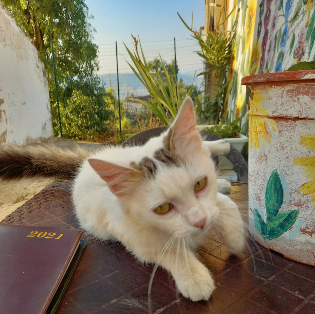 This morning the little white cat appeared quite soon afterwards and I noticed that she had a lump of something that looked like dog poo on her side. She jumped up on the table and wanted stroked.