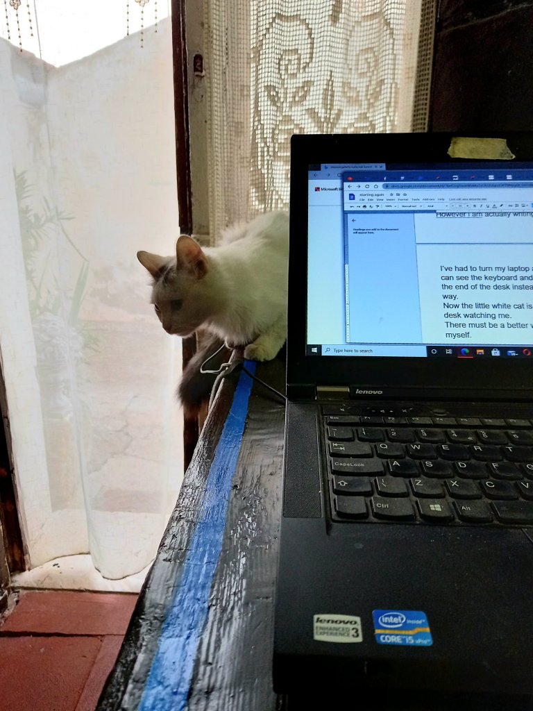 Having dealt with that I sat down at my desk and realised that I couldn’t see my keyboard . So I moved to the end of the desk and that was better. I could look out the door which was nice. I think I’m best at wittering on , so I did. Joined at one point by the little white cat which jumped up on the desk to see what I was doing.