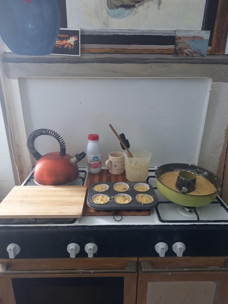 I was lucky to find a tin tray with 6 spaces and I had some paper cases. By turning the gas down as low as possible and putting the shelf right near the top I managed to eventually use up all the mixture and make 24 little cakes only slightly burned on the bottom.