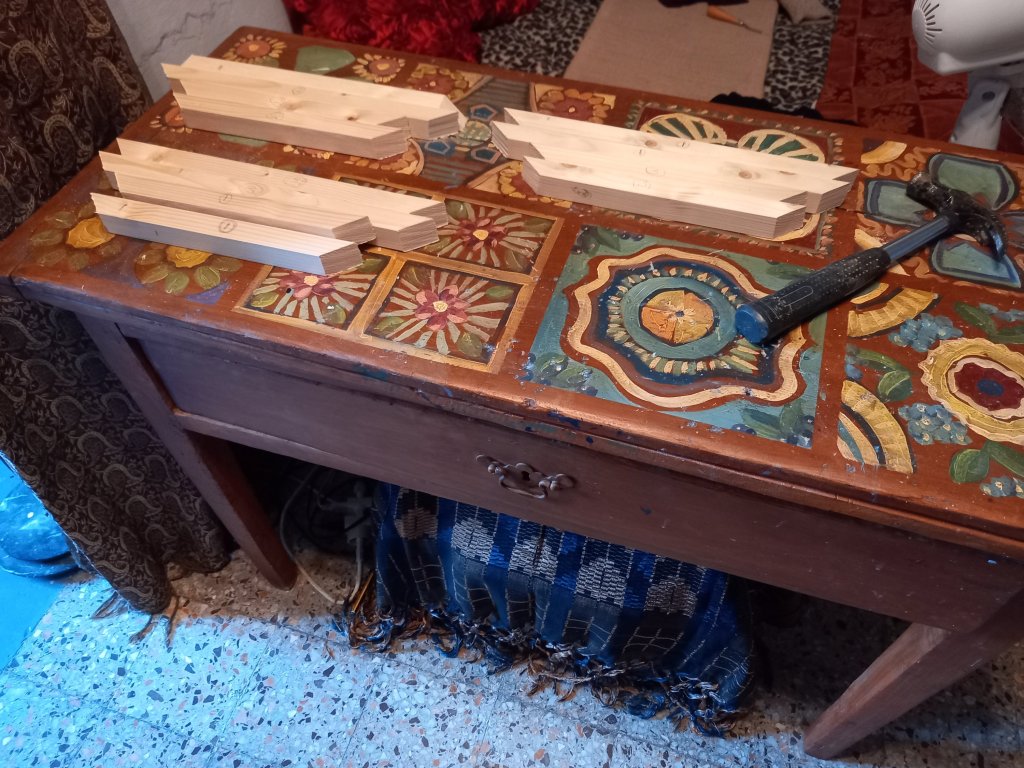 I had decided to use the remains of my slightly thicker wood to make 4 30x40cms stretchers . After 2 hours of sawing I had made three and a half and run out of wood.
