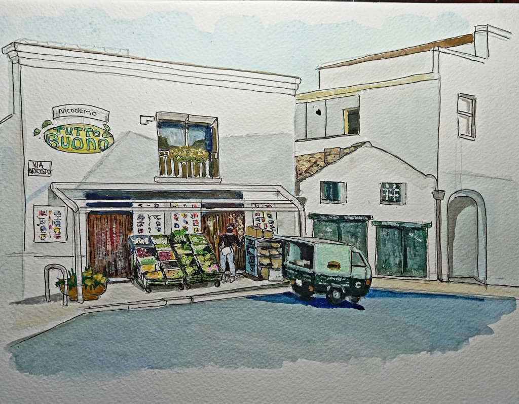 However today has been dry and sunny. And I have more or less finished my first watercolour for the Christmas Market. It feels like a practice one as its a while since I used pen and watercolour. I am reasonably pleased with it.