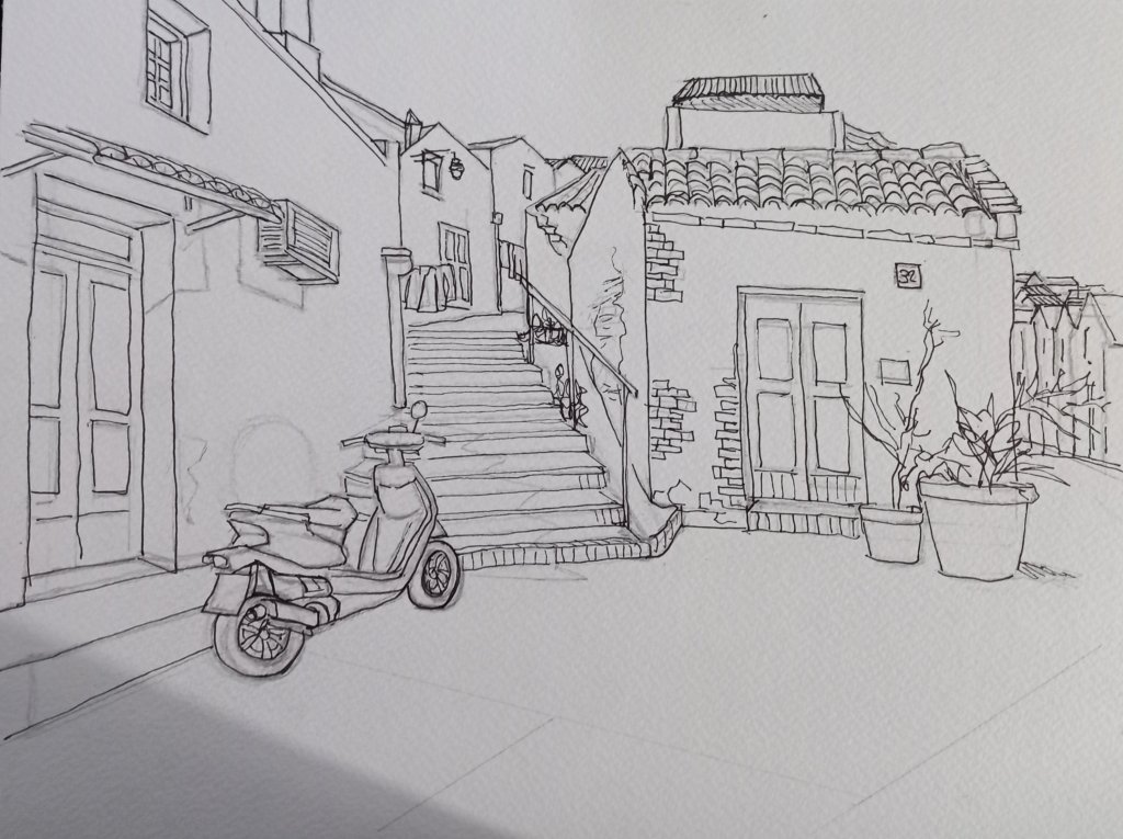 It’s not easy to draw a scooter as I don’t really understand scooters and especially wheels. I can still remember spending 2 hours on a a wheel in a painting I did years ago.
