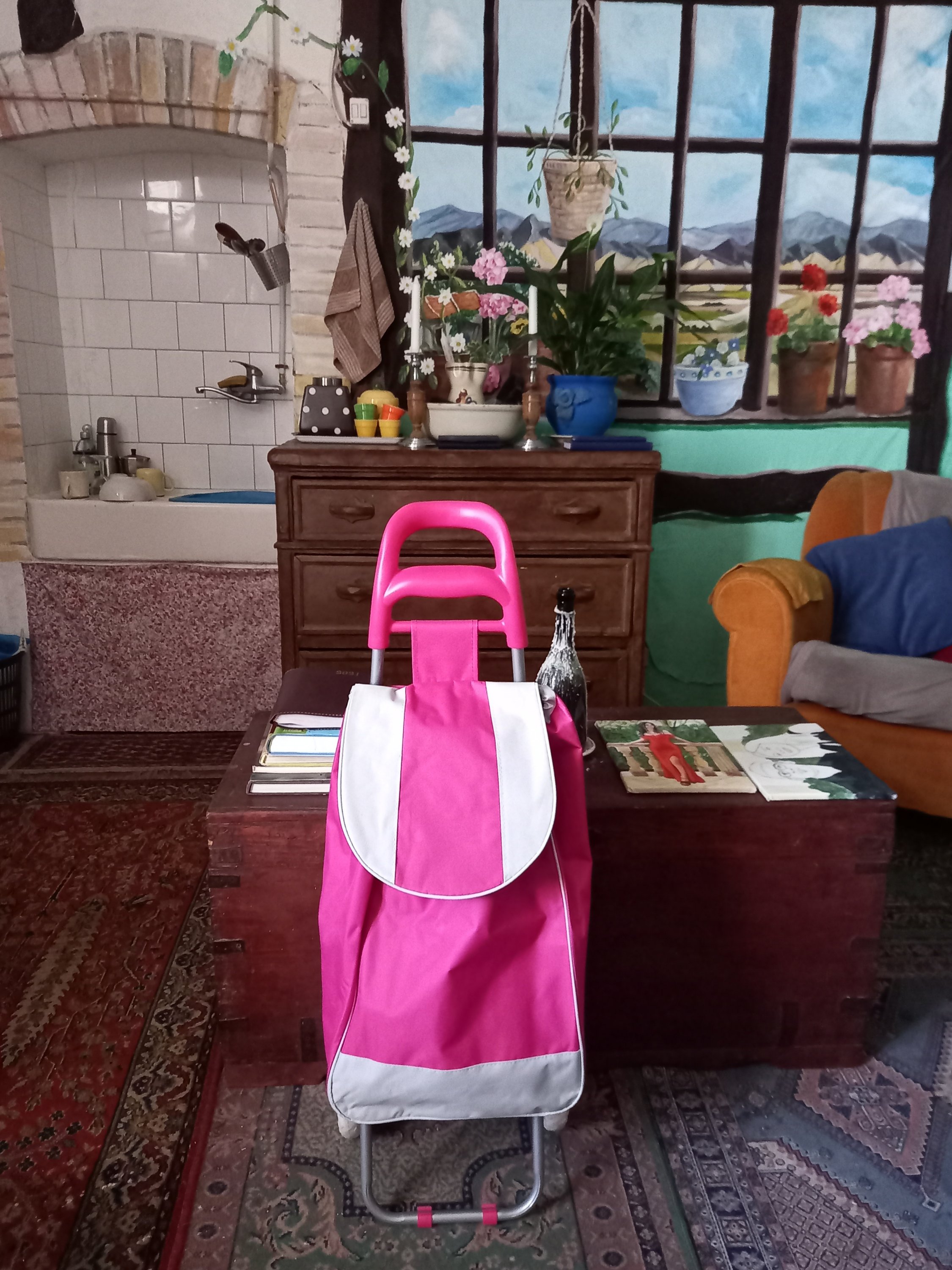 I also bought a bright pink granny trolley to help transport paintings to the Christmas Market . Today I used it to transport 5 litres of my favourite sweet primitive wine.