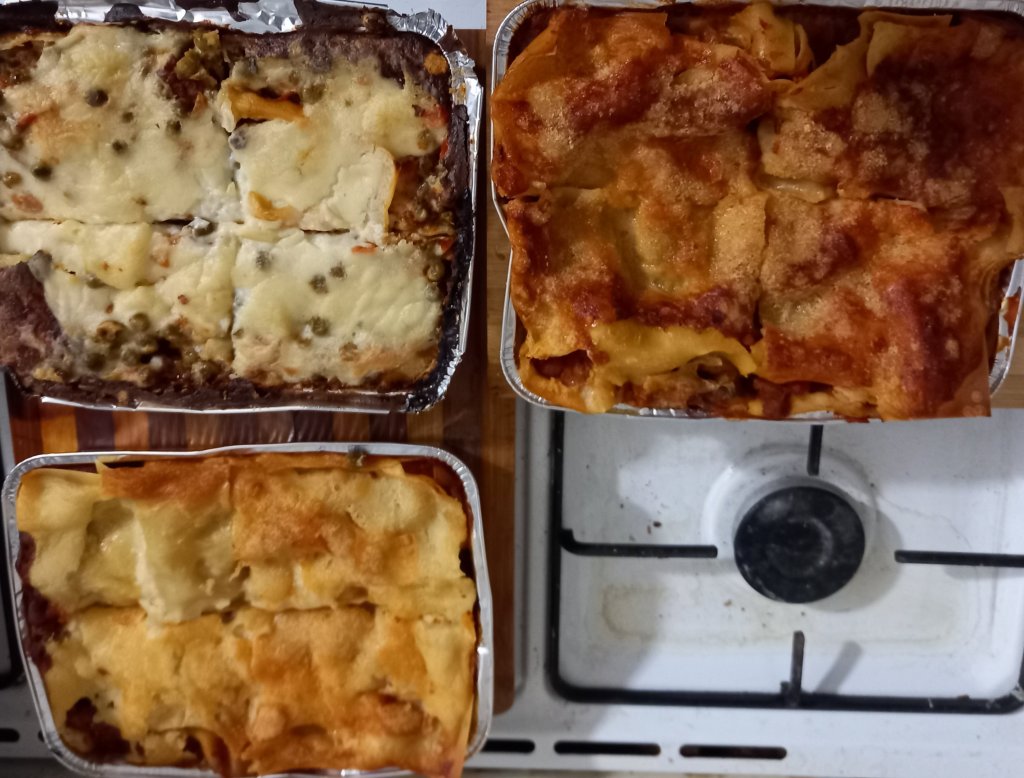 I had 3 trays in all as everything didn’t quite work out with the amount of ingredients . The 3d lasagne is supplemented by a tin of peas and luckily the long life milk lived past its expiry date.