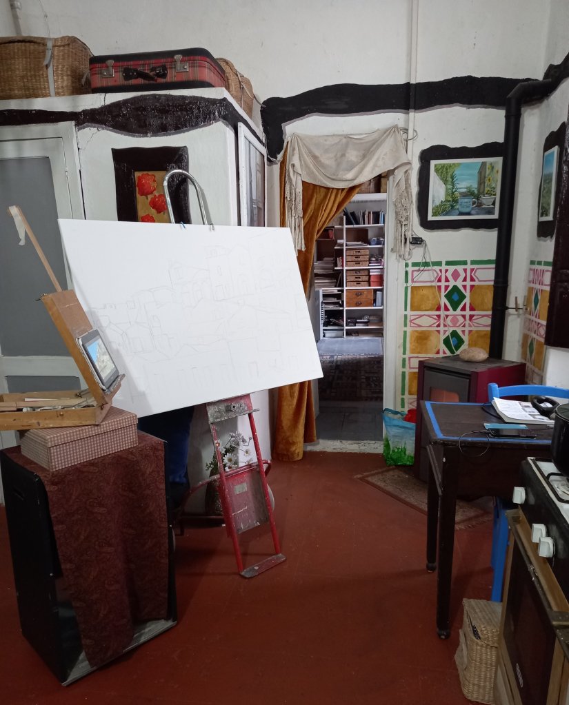 Most of today was spent drawing a big street scene well enough to begin painting. Accompanied as usual by Agatha Raisin.