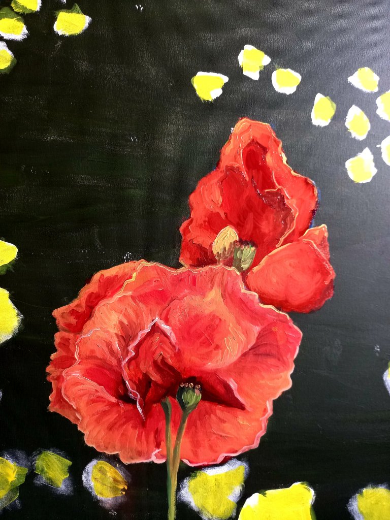 Tomorrow I plan to start the background and will paint the rest of the poppies afterwards….now that I know I can.