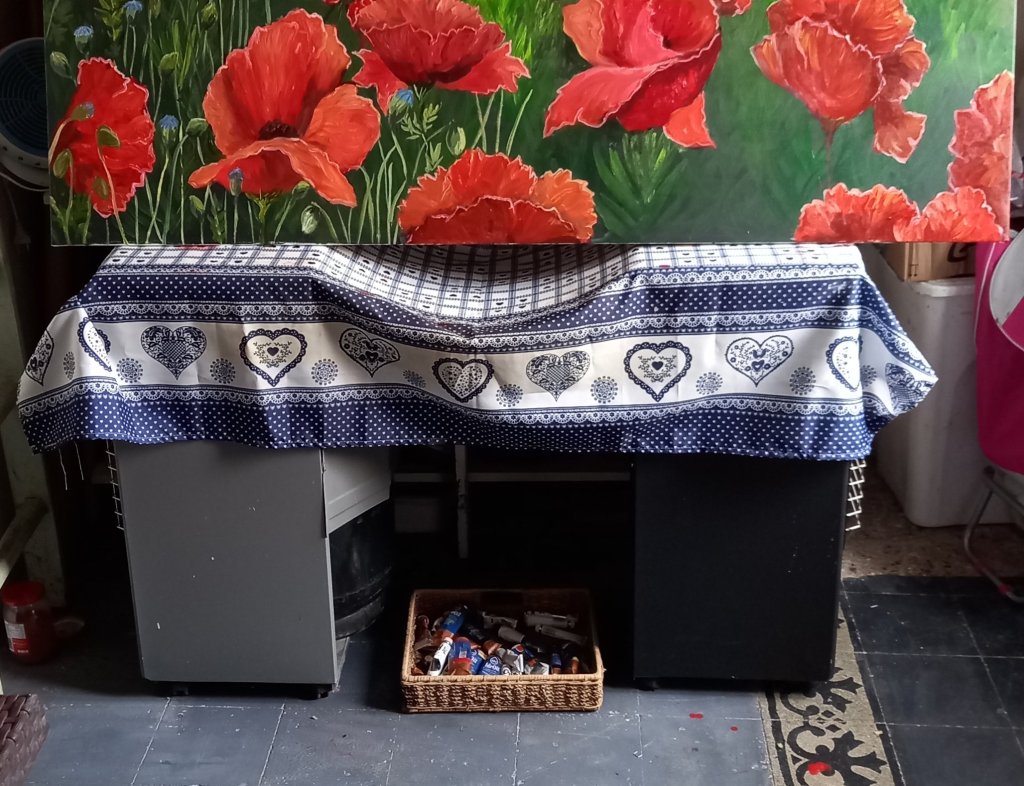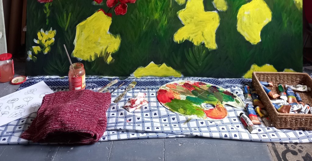 I was prepared to work on my big poppy painting. I had on my knee support thing and my back support thing. It’s not that I am old and creaky, but I thought that I’d be kneeling on the floor leaning forwards to paint poppies and grass etc at the bottom of my painting.