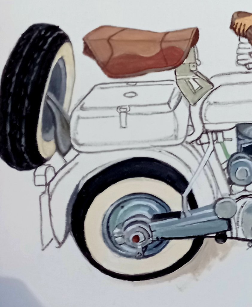 The other part of the painting is a vintage scooter. To say that it’s complicated is an understatement. And as I don’t understand the mechanics of scooters it doesn’t help. The client most certainly will.