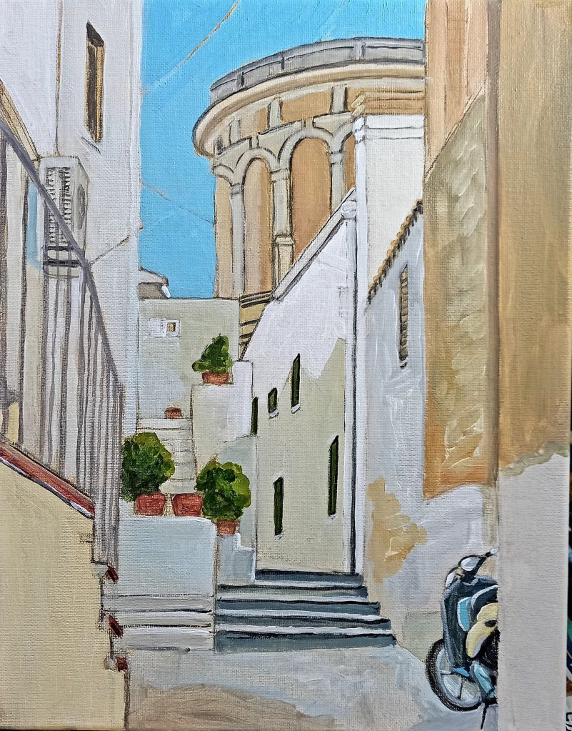 I stopped at lunch time and after a quick trip to the supermarket where I forgot the thing I need most, I carried on with my latest local scene . It includes the top of the water tower, half a scooter and some houses thereby fulfilling the criteria for a saleable painting. Local feature for tourists, someone’s house for locals and scooter for both.