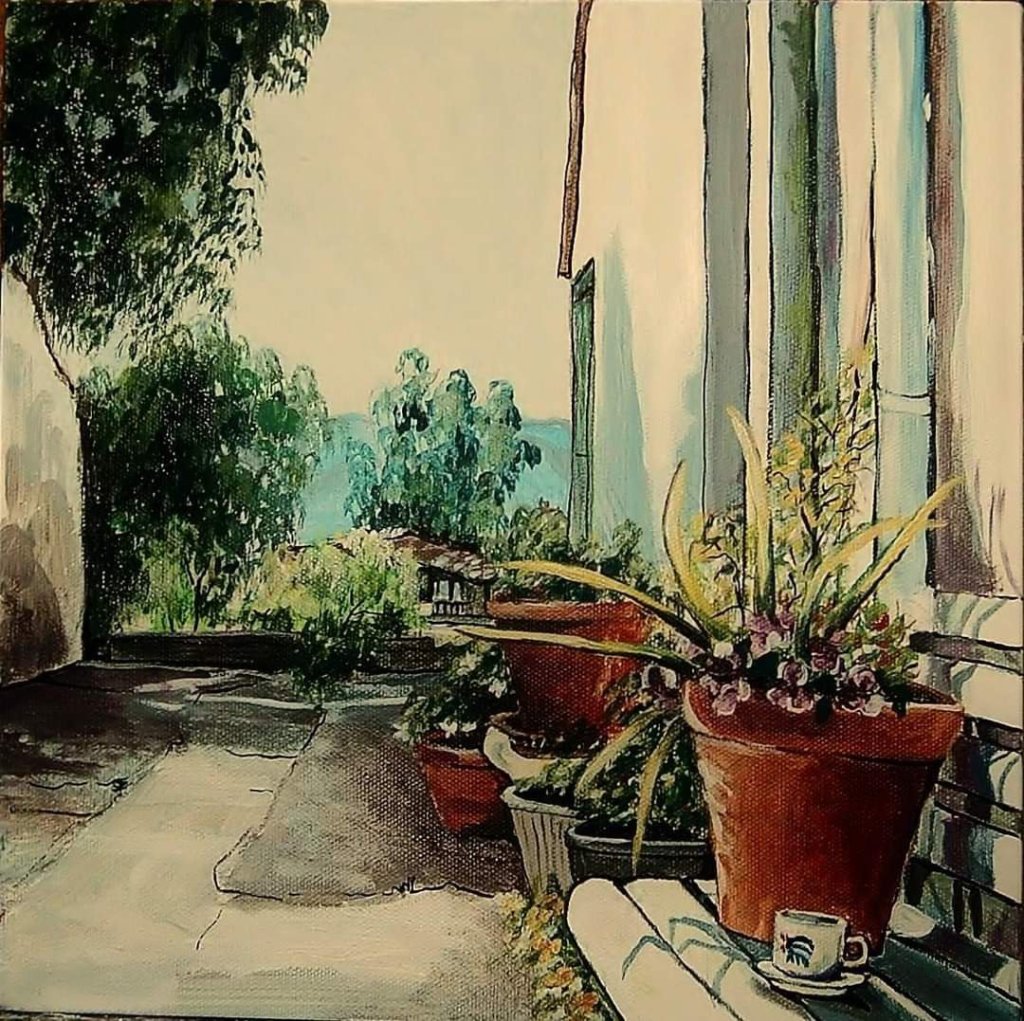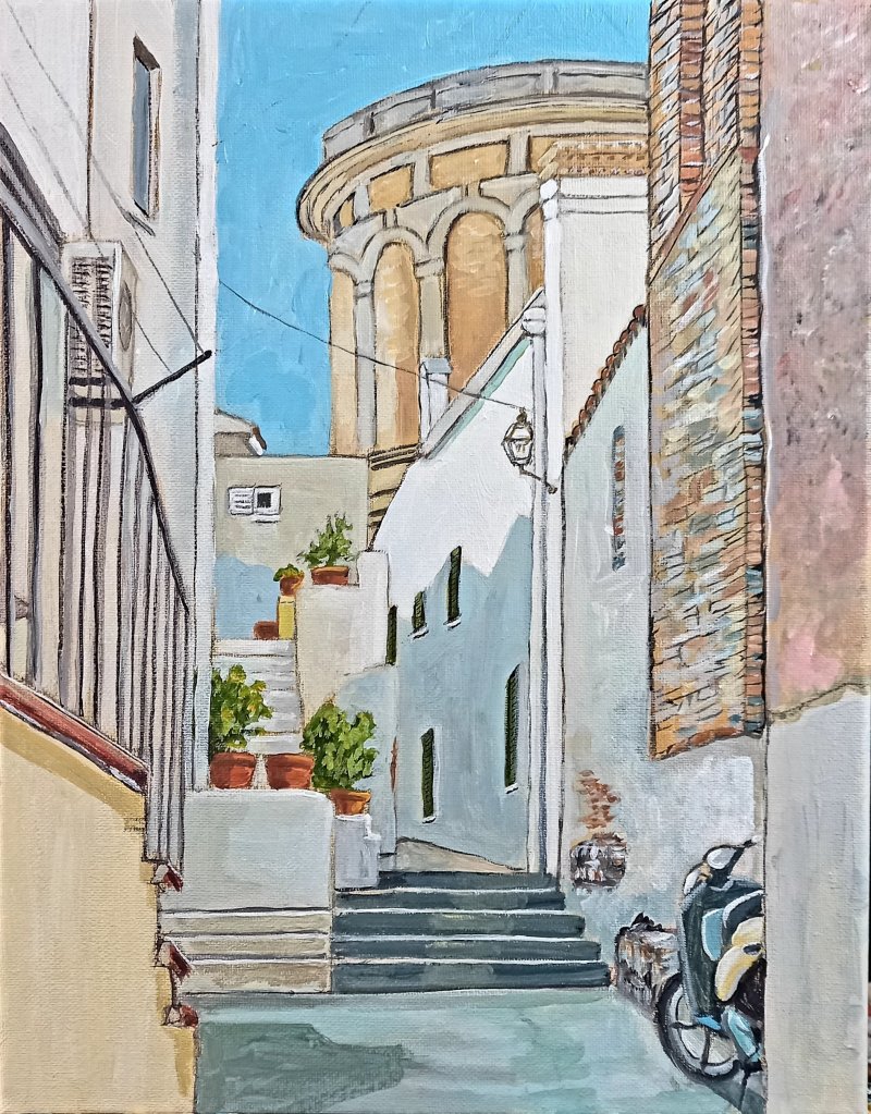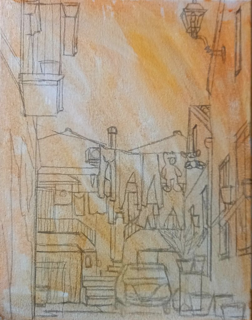 The new scene has at least 3 lines of washing in it. That should be fun to paint, and lots of flowerpots and a car. I’m not very good at painting cars.