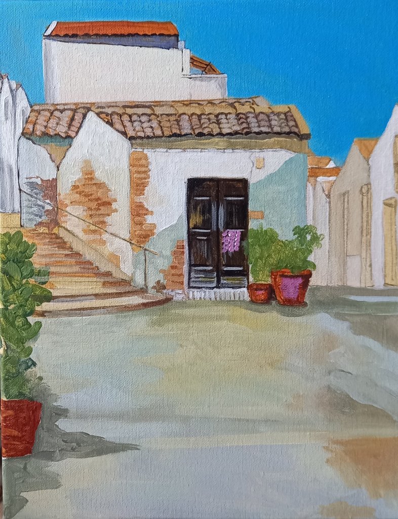 I was really supposed to be painting the castle, church and lots of little white houses today, but I got side tracked and drew local scenes very roughly on ten more canvases.