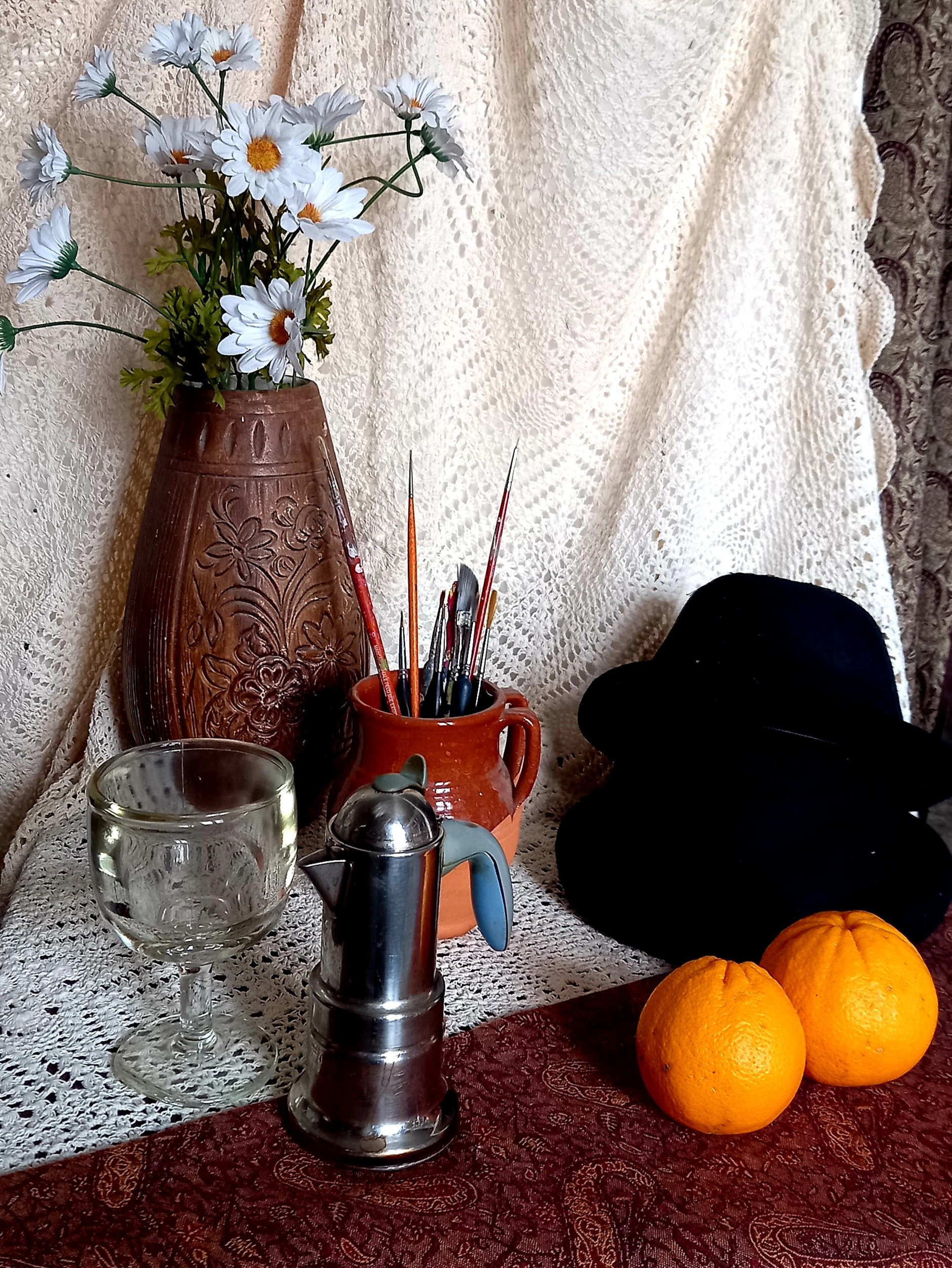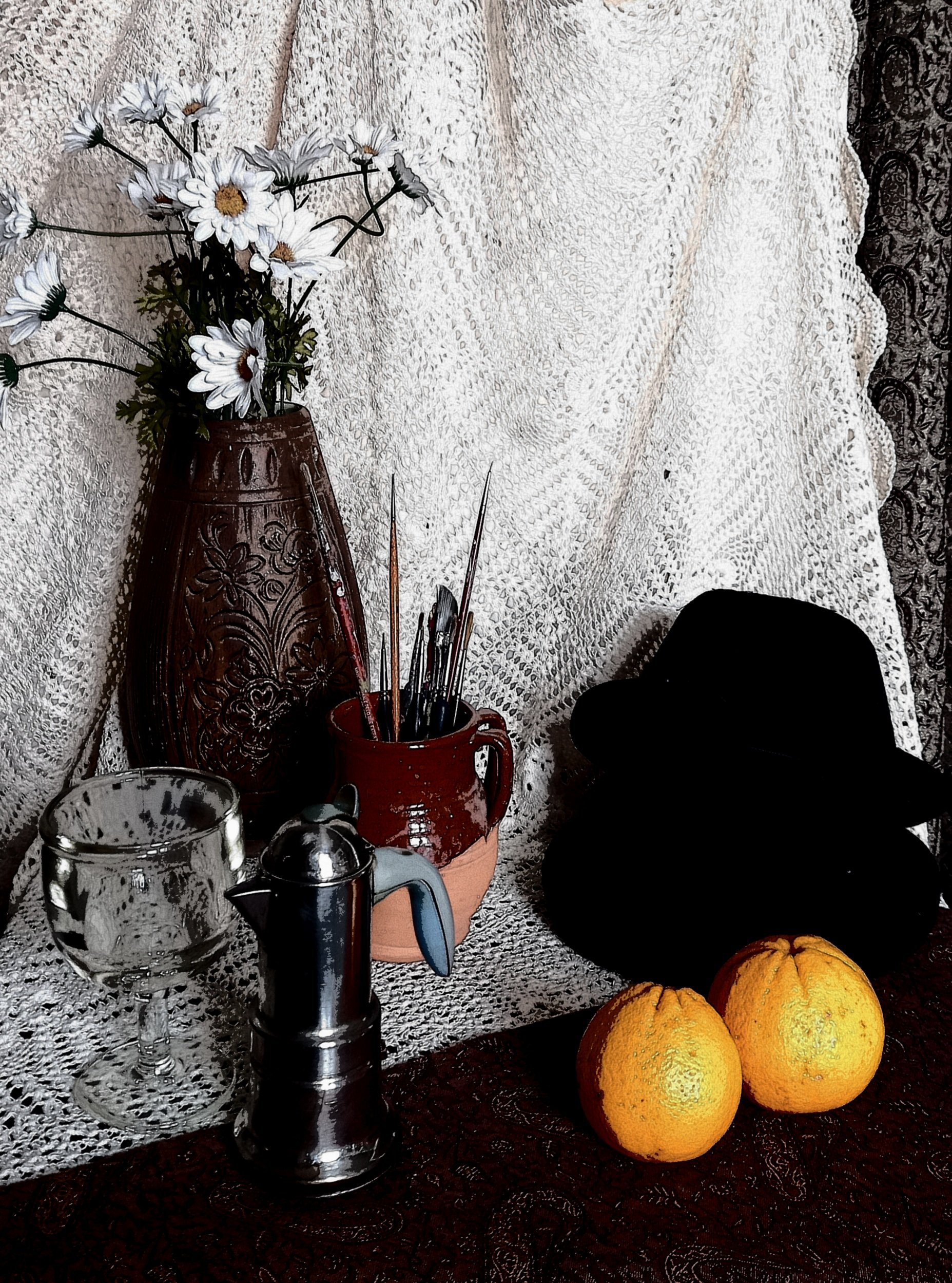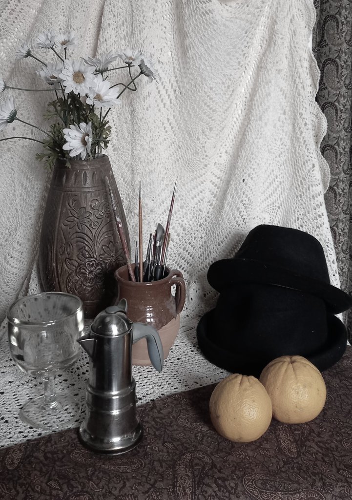 After that I made a still life set up including my lovely coffee pot. And I used the app on my phone to let me see some different versions . It’s too cold to paint through in my work room so I’ll work from a photo.